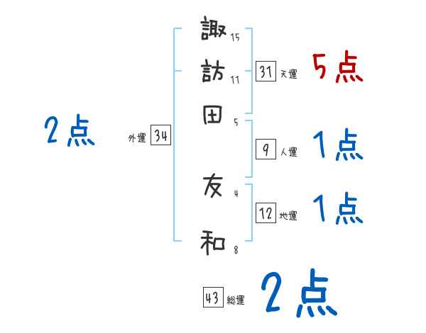 総運![]() | 諏訪田友和さんの総運は43画の2つ星!頑固な性格で独立心が強いかも。やや非現実的で浪費に注意しましょう。 あなたの人生を表す1番重要な運勢です。生涯を通じて影響する総合運となり、主に50歳以降の晩年期に影響を及ぼします。 |