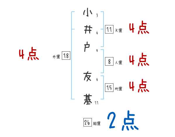 天運![]() | 小井戸友基さんの天運は11画の4つ星!着実に富や地位を得る幸運な人生。 家系が持つ宿命的な運勢を表します。祖先から受け継いだ苗字ですので自分の力が及びません。家柄を象徴します。 |