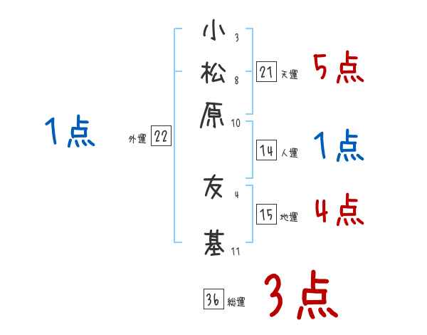 天運![]() | 小松原友基さんの天運は21画の5つ星!統率力がある。独立し成功する。名誉を手に入れる。 家系が持つ宿命的な運勢を表します。祖先から受け継いだ苗字ですので自分の力が及びません。家柄を象徴します。 |