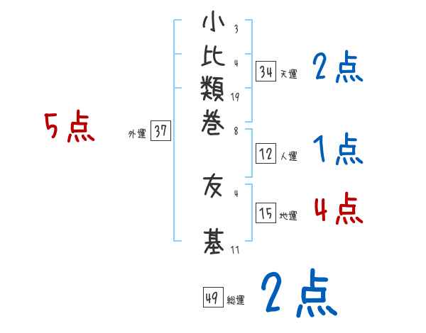 外運![]() | 小比類巻友基さんの外運は37画の5つ星!努力家で順応性に優れる。現実的な考え方ができ忠実に物事をこなす。 生活面を象徴する運勢です。外部から受ける影響力を表し、結婚運、家庭運や職場、環境への順応性を表します。 |