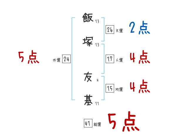 天運![]() | 飯塚友基さんの天運は26画の2つ星!波瀾万丈かも。信頼できる人を大事にしましょう。 家系が持つ宿命的な運勢を表します。祖先から受け継いだ苗字ですので自分の力が及びません。家柄を象徴します。 |