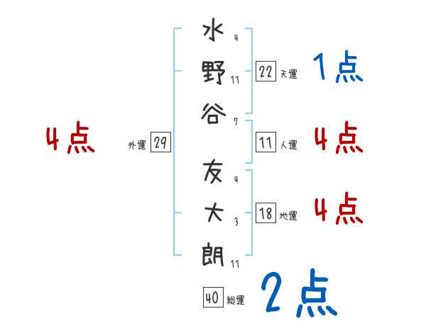 外運![]() | 水野谷友大朗さんの外運は29画の4つ星!完全主義で才能がある。厳格な心の持ち主。 生活面を象徴する運勢です。外部から受ける影響力を表し、結婚運、家庭運や職場、環境への順応性を表します。 |