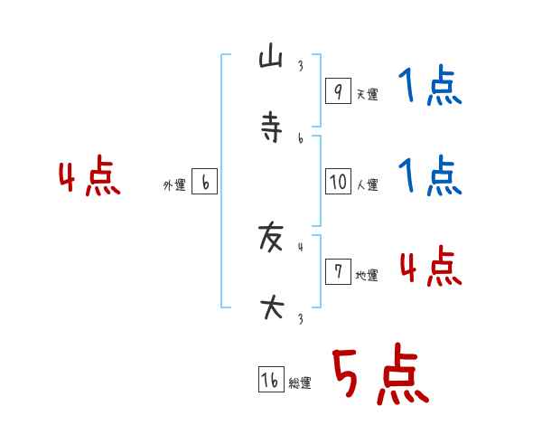総運![]() | 山寺友大さんの総運は16画の5つ星!人望が厚く大きく発展する。逆転成功が見える。 あなたの人生を表す1番重要な運勢です。生涯を通じて影響する総合運となり、主に50歳以降の晩年期に影響を及ぼします。 |