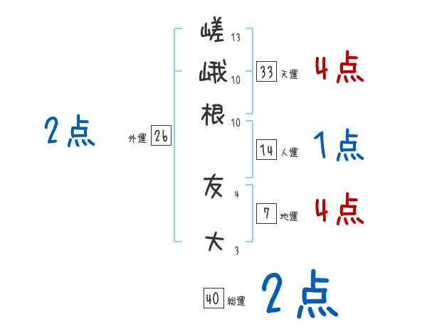 総運![]() | 嵯峨根友大さんの総運は40画の2つ星!自信過剰で物事に固執するためトラブルに注意。 あなたの人生を表す1番重要な運勢です。生涯を通じて影響する総合運となり、主に50歳以降の晩年期に影響を及ぼします。 |
