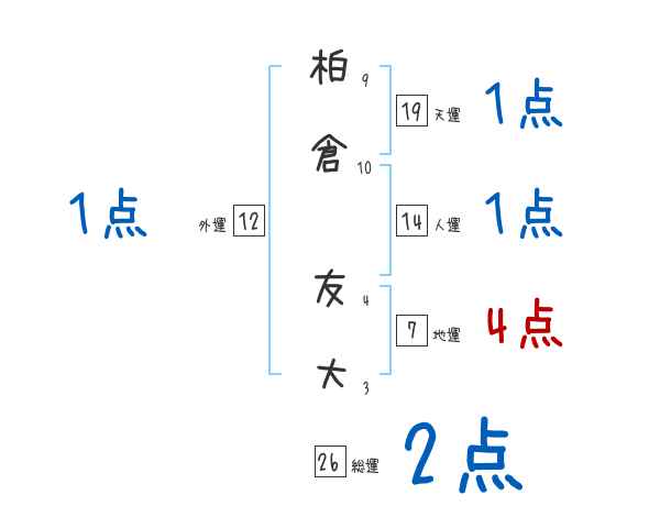 天運![]() | 柏倉友大さんの天運は19画の1つ星!優れた才能を持ちますが、協調性が足りないことも。周りの人と協力する事を意識しましょう。 家系が持つ宿命的な運勢を表します。祖先から受け継いだ苗字ですので自分の力が及びません。家柄を象徴します。 |