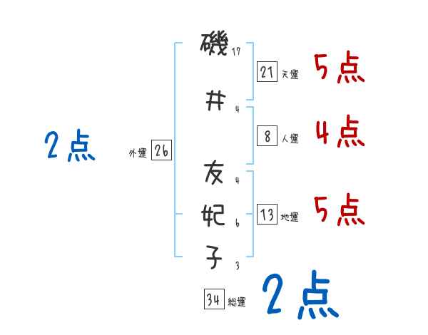 外運![]() | 磯井友妃子さんの外運は26画の2つ星!波瀾万丈かも。信頼できる人を大事にしましょう。 生活面を象徴する運勢です。外部から受ける影響力を表し、結婚運、家庭運や職場、環境への順応性を表します。 |