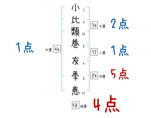 外運![]() | 小比類巻友季恵さんの外運は46画の1つ星!迷走することが多く苦労するかも。目先のことにとらわれないように。 生活面を象徴する運勢です。外部から受ける影響力を表し、結婚運、家庭運や職場、環境への順応性を表します。 |