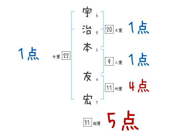 外運![]() | 宇治本友宏さんの外運は22画の1つ星!努力することが苦手ないっぽう手先が器用。芸術性にも優れる。 生活面を象徴する運勢です。外部から受ける影響力を表し、結婚運、家庭運や職場、環境への順応性を表します。 |