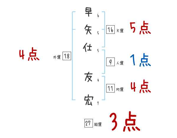 外運![]() | 早矢仕友宏さんの外運は18画の4つ星!情熱的で剛気。忍耐力があり信頼される。 生活面を象徴する運勢です。外部から受ける影響力を表し、結婚運、家庭運や職場、環境への順応性を表します。 |