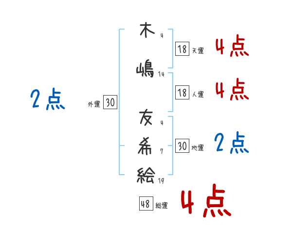 天運![]() | 木嶋友希絵さんの天運は18画の4つ星!情熱的で剛気。忍耐力があり信頼される。 家系が持つ宿命的な運勢を表します。祖先から受け継いだ苗字ですので自分の力が及びません。家柄を象徴します。 |