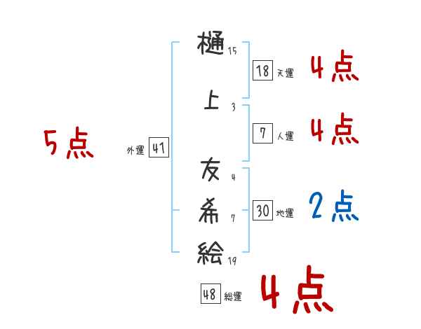天運![]() | 樋上友希絵さんの天運は18画の4つ星!情熱的で剛気。忍耐力があり信頼される。 家系が持つ宿命的な運勢を表します。祖先から受け継いだ苗字ですので自分の力が及びません。家柄を象徴します。 |