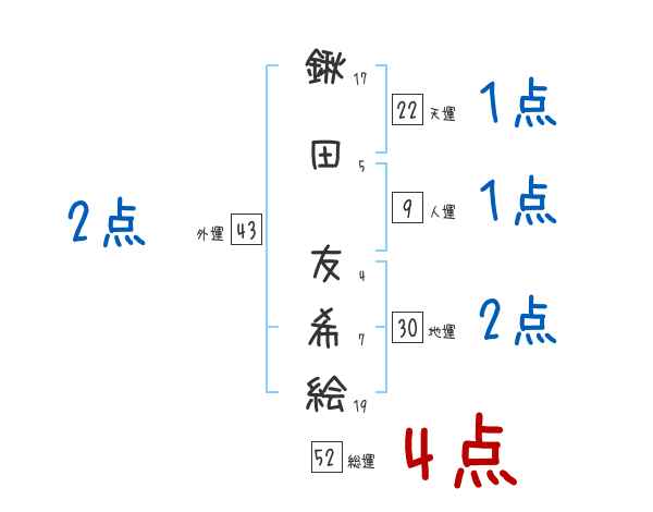 外運![]() | 鍬田友希絵さんの外運は43画の2つ星!頑固な性格で独立心が強いかも。やや非現実的で浪費に注意しましょう。 生活面を象徴する運勢です。外部から受ける影響力を表し、結婚運、家庭運や職場、環境への順応性を表します。 |