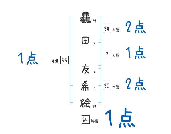 天運![]() | 靏田友希絵さんの天運は34画の2つ星!独創性に優れるが、自尊心が強く災難に注意しましょう。 家系が持つ宿命的な運勢を表します。祖先から受け継いだ苗字ですので自分の力が及びません。家柄を象徴します。 |