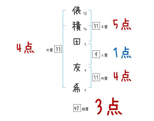 外運![]() | 俵積田友希さんの外運は33画の4つ星!権力志向でプライドが高い。勇気があり運を切り開き成功する。 生活面を象徴する運勢です。外部から受ける影響力を表し、結婚運、家庭運や職場、環境への順応性を表します。 |