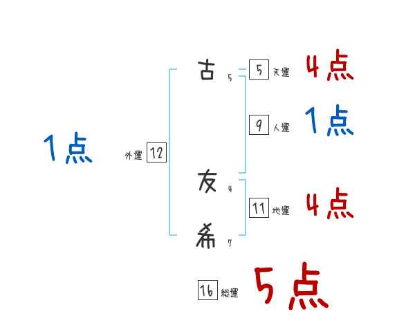 天運![]() | 古友希さんの天運は5画の4つ星!健康で安泰。協調性に優れ、財産に恵まれる。 家系が持つ宿命的な運勢を表します。祖先から受け継いだ苗字ですので自分の力が及びません。家柄を象徴します。 |