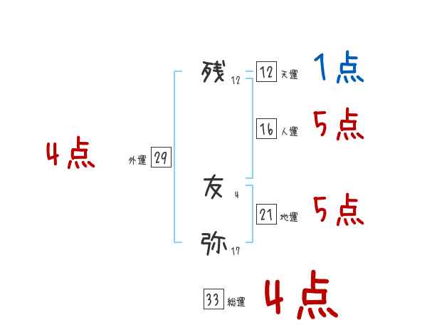 人運![]() | 残友弥さんの人運は16画の5つ星!人望が厚く大きく発展する。逆転成功が見える。 性格や才能などを表す2番目に重要な運勢です。人間関係や協調性、社会的な成功に影響します。主に20歳から50歳ぐらいまでの中年期の運勢を表します。 |