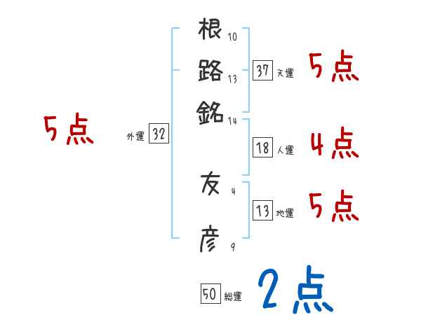 外運![]() | 根路銘友彦さんの外運は32画の5つ星!柔軟性があり成功する。チャンスが多く金運が良い。 生活面を象徴する運勢です。外部から受ける影響力を表し、結婚運、家庭運や職場、環境への順応性を表します。 |