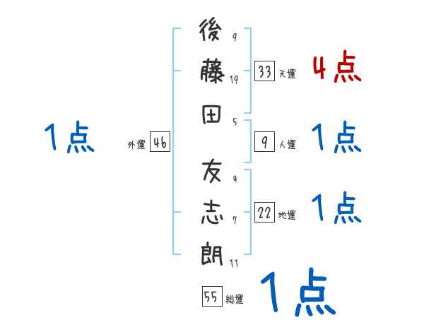 天運![]() | 後藤田友志朗さんの天運は33画の4つ星!権力志向でプライドが高い。勇気があり運を切り開き成功する。 家系が持つ宿命的な運勢を表します。祖先から受け継いだ苗字ですので自分の力が及びません。家柄を象徴します。 |