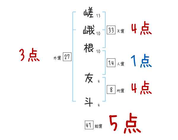天運![]() | 嵯峨根友斗さんの天運は33画の4つ星!権力志向でプライドが高い。勇気があり運を切り開き成功する。 家系が持つ宿命的な運勢を表します。祖先から受け継いだ苗字ですので自分の力が及びません。家柄を象徴します。 |