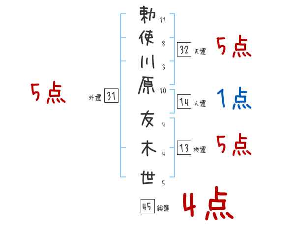 天運![]() | 勅使川原友木世さんの天運は32画の5つ星!柔軟性があり成功する。チャンスが多く金運が良い。 家系が持つ宿命的な運勢を表します。祖先から受け継いだ苗字ですので自分の力が及びません。家柄を象徴します。 |
