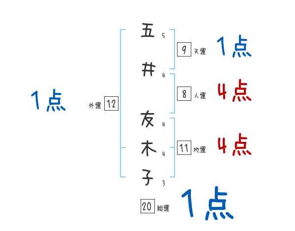 天運![]() | 五井友木子さんの天運は9画の1つ星!消極的で才能を発揮することが苦手なことも。周りの意見に耳を傾けましょう。 家系が持つ宿命的な運勢を表します。祖先から受け継いだ苗字ですので自分の力が及びません。家柄を象徴します。 |