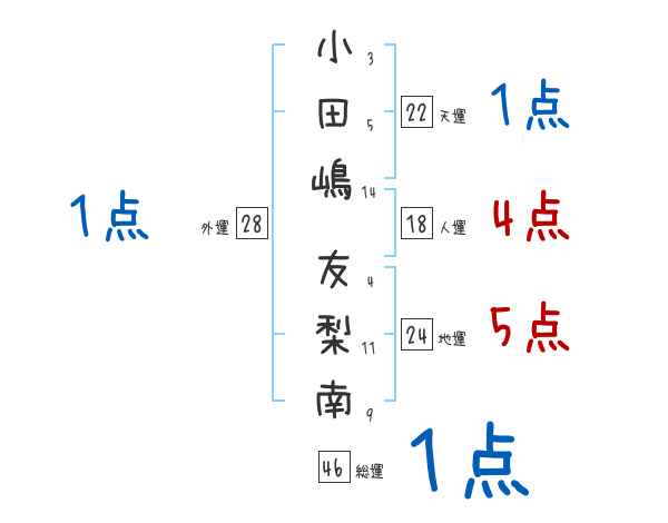 外運![]() | 小田嶋友梨南さんの外運は28画の1つ星!家庭環境に注意。スポーツで活躍できる能力があるかも。 生活面を象徴する運勢です。外部から受ける影響力を表し、結婚運、家庭運や職場、環境への順応性を表します。 |