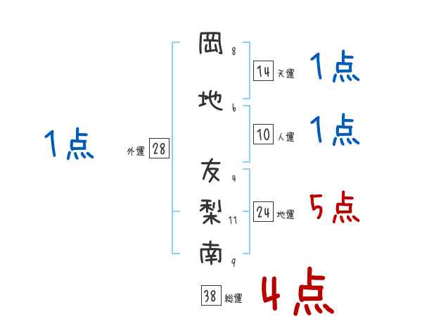 外運![]() | 岡地友梨南さんの外運は28画の1つ星!家庭環境に注意。スポーツで活躍できる能力があるかも。 生活面を象徴する運勢です。外部から受ける影響力を表し、結婚運、家庭運や職場、環境への順応性を表します。 |