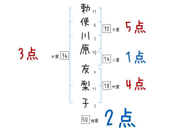 天運![]() | 勅使川原友梨子さんの天運は32画の5つ星!柔軟性があり成功する。チャンスが多く金運が良い。 家系が持つ宿命的な運勢を表します。祖先から受け継いだ苗字ですので自分の力が及びません。家柄を象徴します。 |