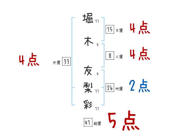 外運![]() | 堀木友梨彩さんの外運は33画の4つ星!権力志向でプライドが高い。勇気があり運を切り開き成功する。 生活面を象徴する運勢です。外部から受ける影響力を表し、結婚運、家庭運や職場、環境への順応性を表します。 |