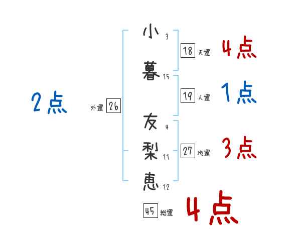 外運![]() | 小暮友梨恵さんの外運は26画の2つ星!波瀾万丈かも。信頼できる人を大事にしましょう。 生活面を象徴する運勢です。外部から受ける影響力を表し、結婚運、家庭運や職場、環境への順応性を表します。 |
