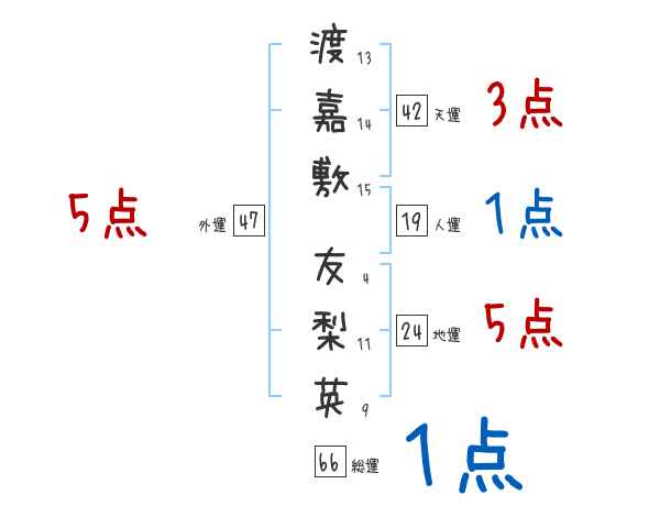 総運![]() | 渡嘉敷友梨英さんの総運は66画の1つ星!迷うことが多く挫折しやすい傾向が。辛抱強く物事に取り組みましょう。 あなたの人生を表す1番重要な運勢です。生涯を通じて影響する総合運となり、主に50歳以降の晩年期に影響を及ぼします。 |