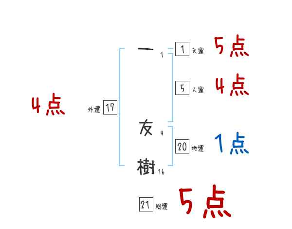 天運![]() | 一友樹さんの天運は1画の5つ星!行動力、指導力があり出世し繁栄する。幸運に恵まれる。 家系が持つ宿命的な運勢を表します。祖先から受け継いだ苗字ですので自分の力が及びません。家柄を象徴します。 |
