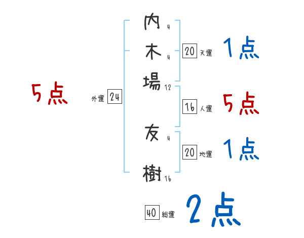 人運![]() | 内木場友樹さんの人運は16画の5つ星!人望が厚く大きく発展する。逆転成功が見える。 性格や才能などを表す2番目に重要な運勢です。人間関係や協調性、社会的な成功に影響します。主に20歳から50歳ぐらいまでの中年期の運勢を表します。 |