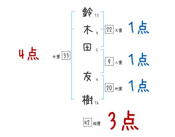 総運![]() | 鈴木田友樹さんの総運は42画の3つ星!病気に注意。多芸であるが消極的でおとなしい。 あなたの人生を表す1番重要な運勢です。生涯を通じて影響する総合運となり、主に50歳以降の晩年期に影響を及ぼします。 |