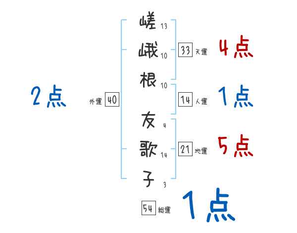 天運![]() | 嵯峨根友歌子さんの天運は33画の4つ星!権力志向でプライドが高い。勇気があり運を切り開き成功する。 家系が持つ宿命的な運勢を表します。祖先から受け継いだ苗字ですので自分の力が及びません。家柄を象徴します。 |