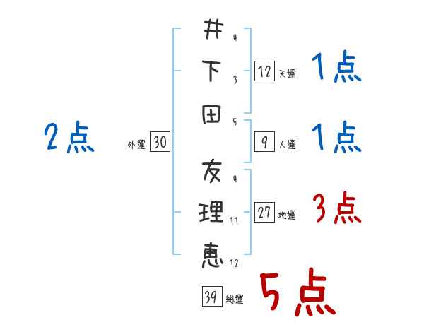 総運![]() | 井下田友理恵さんの総運は39画の5つ星!社交性に優れ人望が厚い。人の上に立ち成功する。 あなたの人生を表す1番重要な運勢です。生涯を通じて影響する総合運となり、主に50歳以降の晩年期に影響を及ぼします。 |