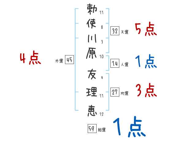 天運![]() | 勅使川原友理恵さんの天運は32画の5つ星!柔軟性があり成功する。チャンスが多く金運が良い。 家系が持つ宿命的な運勢を表します。祖先から受け継いだ苗字ですので自分の力が及びません。家柄を象徴します。 |
