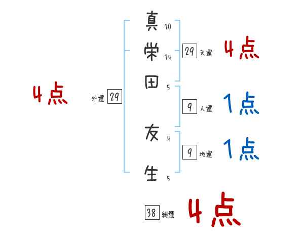 外運![]() | 真栄田友生さんの外運は29画の4つ星!完全主義で才能がある。厳格な心の持ち主。 生活面を象徴する運勢です。外部から受ける影響力を表し、結婚運、家庭運や職場、環境への順応性を表します。 |