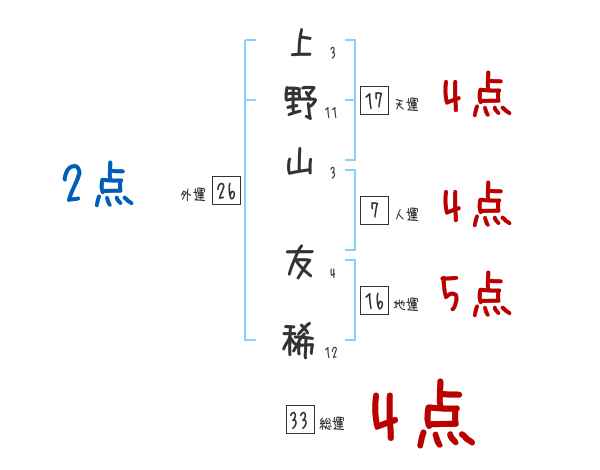 外運![]() | 上野山友稀さんの外運は26画の2つ星!波瀾万丈かも。信頼できる人を大事にしましょう。 生活面を象徴する運勢です。外部から受ける影響力を表し、結婚運、家庭運や職場、環境への順応性を表します。 |