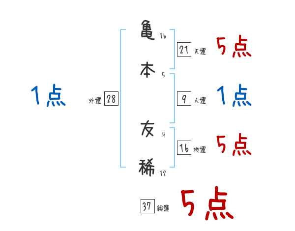 天運![]() | 亀本友稀さんの天運は21画の5つ星!統率力がある。独立し成功する。名誉を手に入れる。 家系が持つ宿命的な運勢を表します。祖先から受け継いだ苗字ですので自分の力が及びません。家柄を象徴します。 |