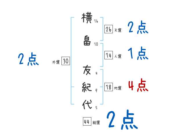 総運![]() | 横畠友紀代さんの総運は44画の2つ星!誠実で慎重な性格。物事を考えすぎないように注意しましょう。 あなたの人生を表す1番重要な運勢です。生涯を通じて影響する総合運となり、主に50歳以降の晩年期に影響を及ぼします。 |