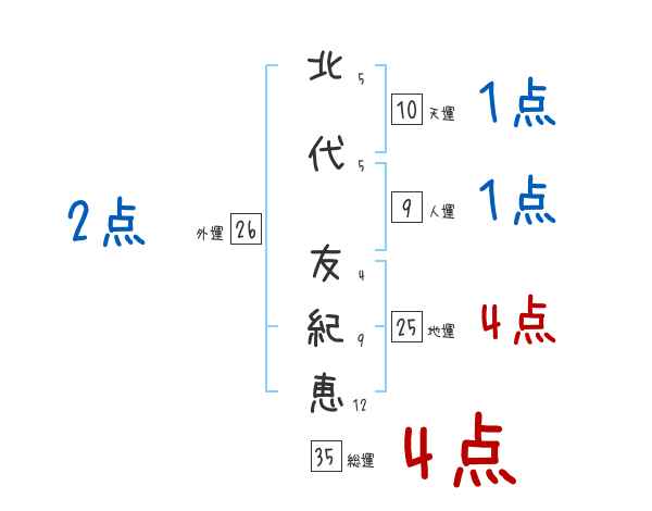 天運![]() | 北代友紀恵さんの天運は10画の1つ星!不安を感じやすい傾向。ストレスを抱えないように注意しましょう。 家系が持つ宿命的な運勢を表します。祖先から受け継いだ苗字ですので自分の力が及びません。家柄を象徴します。 |