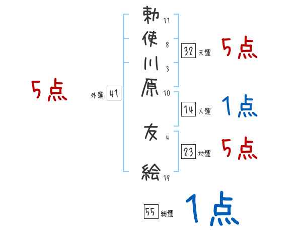 天運![]() | 勅使川原友絵さんの天運は32画の5つ星!柔軟性があり成功する。チャンスが多く金運が良い。 家系が持つ宿命的な運勢を表します。祖先から受け継いだ苗字ですので自分の力が及びません。家柄を象徴します。 |