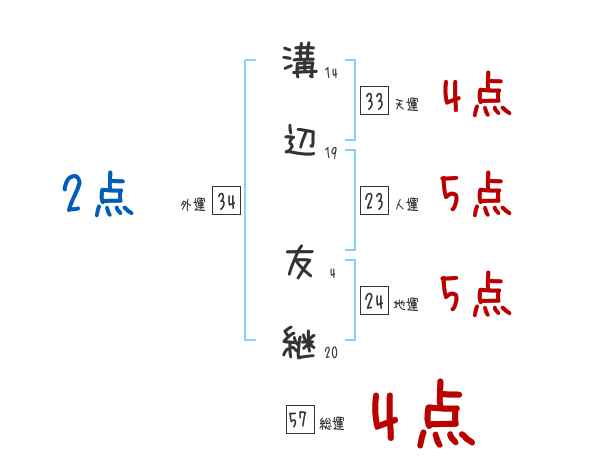 総運![]() | 溝辺友継さんの総運は57画の4つ星!向上心があり人望がある。地位を得る。 あなたの人生を表す1番重要な運勢です。生涯を通じて影響する総合運となり、主に50歳以降の晩年期に影響を及ぼします。 |