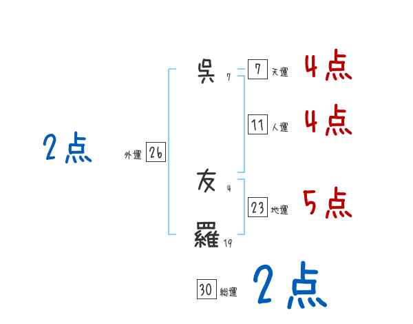 天運![]() | 呉友羅さんの天運は7画の4つ星!強い意志や信念を持ち独立心が強い。自立する。 家系が持つ宿命的な運勢を表します。祖先から受け継いだ苗字ですので自分の力が及びません。家柄を象徴します。 |