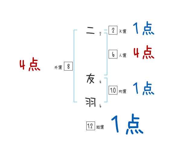 天運![]() | 二友羽さんの天運は2画の1つ星!優しいですが積極性や意思の強さに欠ける傾向があります。家庭環境の乱れに注意しましょう。 家系が持つ宿命的な運勢を表します。祖先から受け継いだ苗字ですので自分の力が及びません。家柄を象徴します。 |