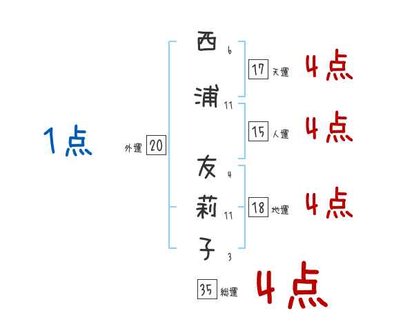 天運![]() | 西浦友莉子さんの天運は17画の4つ星!積極的な行動力。地位を気づき財産を手に入れる。純粋な心と直感力。 家系が持つ宿命的な運勢を表します。祖先から受け継いだ苗字ですので自分の力が及びません。家柄を象徴します。 |