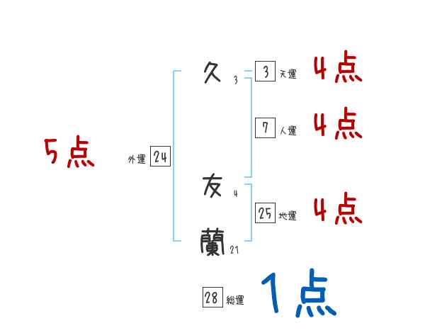 総運![]() | 久友蘭さんの総運は28画の1つ星!家庭環境に注意。スポーツで活躍できる能力があるかも。 あなたの人生を表す1番重要な運勢です。生涯を通じて影響する総合運となり、主に50歳以降の晩年期に影響を及ぼします。 |