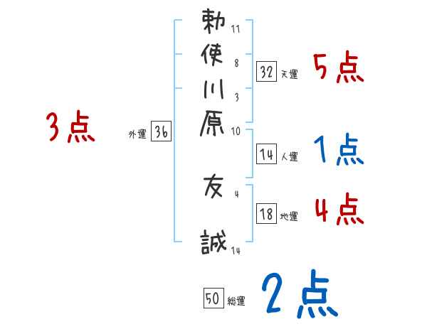 天運![]() | 勅使川原友誠さんの天運は32画の5つ星!柔軟性があり成功する。チャンスが多く金運が良い。 家系が持つ宿命的な運勢を表します。祖先から受け継いだ苗字ですので自分の力が及びません。家柄を象徴します。 |