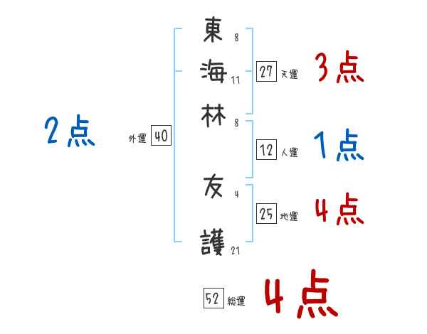 総運![]() | 東海林友護さんの総運は52画の4つ星!先見性と独創性に優れ考える力がある。強運の持ち主。 あなたの人生を表す1番重要な運勢です。生涯を通じて影響する総合運となり、主に50歳以降の晩年期に影響を及ぼします。 |